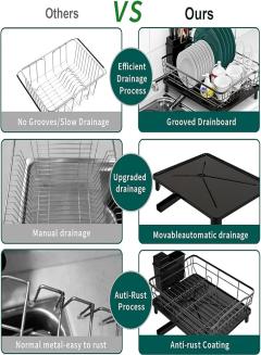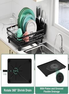 【Dish Drying Rack with Rotatable Drain Spout】 This black dish drying rack features a 360° rotatable drain spout, allowing water to flow directly into the sink through the drain pipe, keeping your countertop dry and clean.