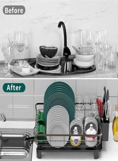 【Post-Sales Service】The dishes drying rack set includes 1 dish rack, 1 drainboard, 1 utensil holder, 1 Dish Drying Mat, 4 non-slip silicone pads, and 1 installation manual. Our top engineers pay attention to every detail. For any questions about this drying rack, please feel free to contact us at any time.
